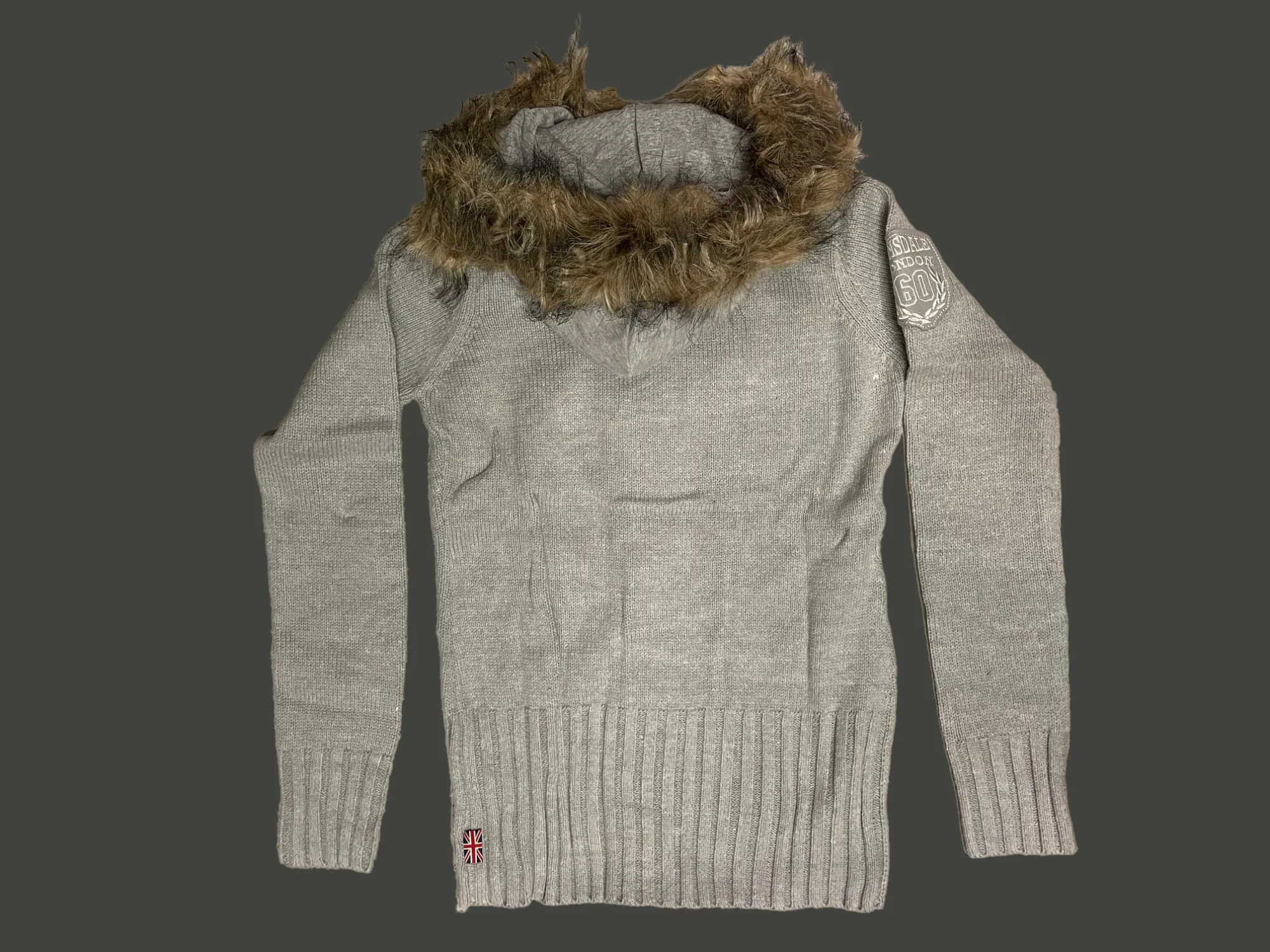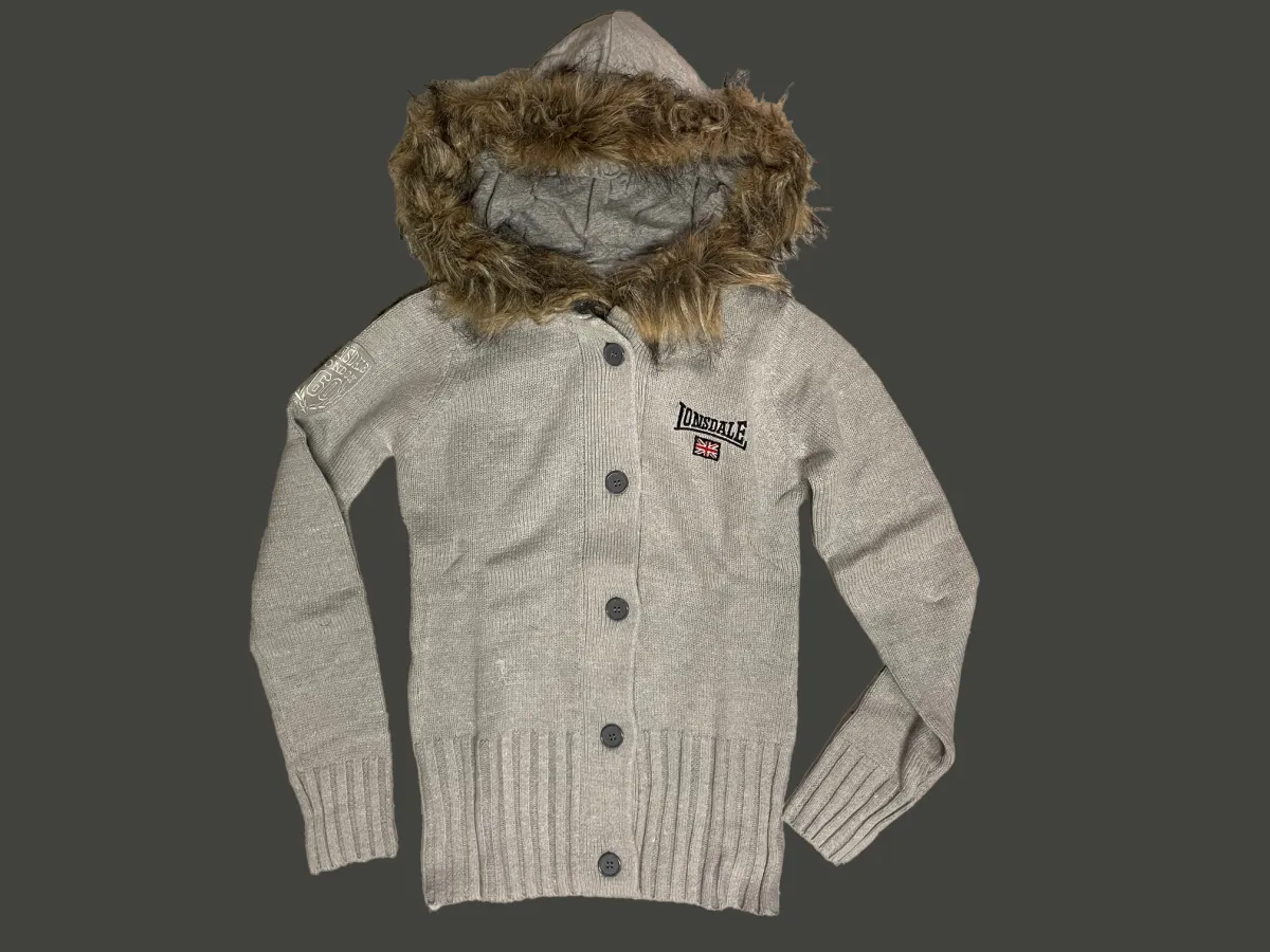 Knitted hooded sweatshirt with buttons. Chest embroidery. Badge on sleeve. Fleese hood with fake fur at edge. 60% acryl, 40% cotton. Women's, medium. Soft Grey.