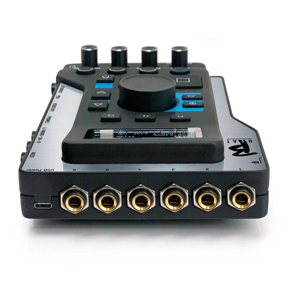 B.Beat supports Mp3, Wav, Stems, MTA1 and audio projects with up to 16 mono or 8 stereo tracks. It also reads videos and JPGs in sync with the music. It comes with a digital mixer with 6 outputs for separate tracks. It has two inputs to receive, for example, a return from the mixer, and with 4 potentiometers the musician can independently balance the headphone listening. B.Beat detects the Click track and plays it both on the dedicated output and on the headphones.