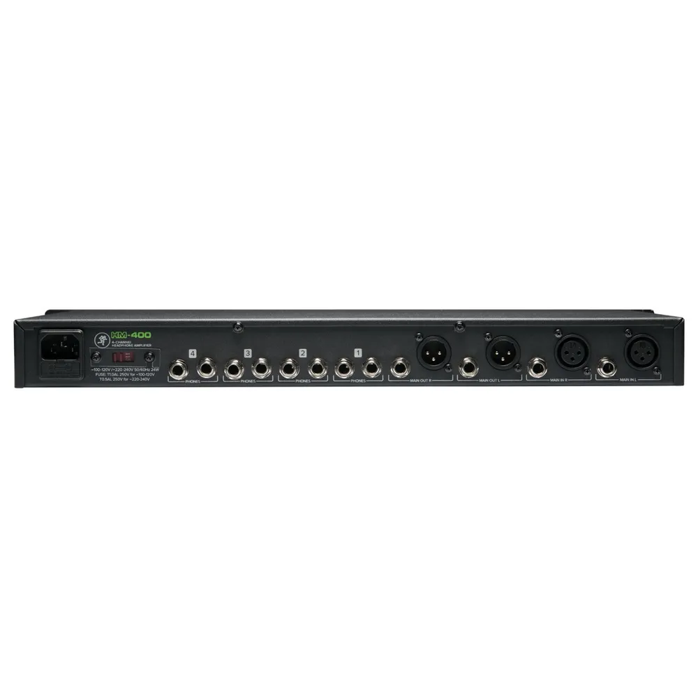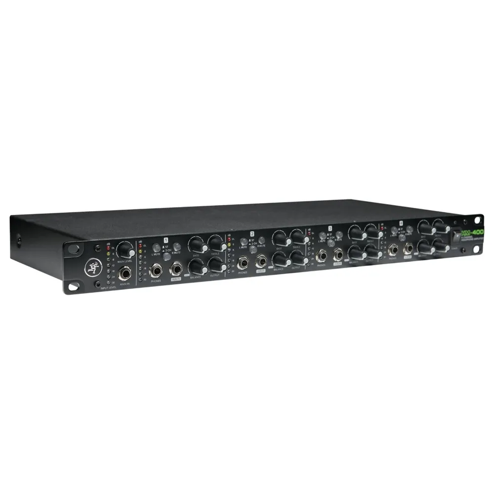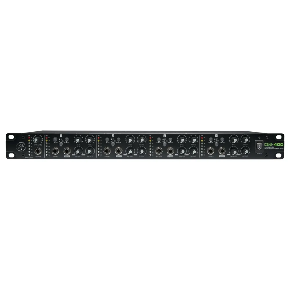 The Mackie HM-400 Headphone Amp features four independent input channels and a total of 12 headphone outputs, allowing multiple people to monitor audio with ease and precision. The Mackie HM-400 offers L/R stereo inputs and outputs, along with front panel 1/4'' aux inputs and 7 segment LED metering per channel. The front panel provides mute and stereo/2-ch mode switches, 2-band EQ controls, independent output level controls and balance controls for mixing the main and aux signals. Complete with a 1U rack-mountable chassis, the Mackie HM-400 amp is perfect for installed applications within performance venues, houses of worship, recording studios and practice spaces.
