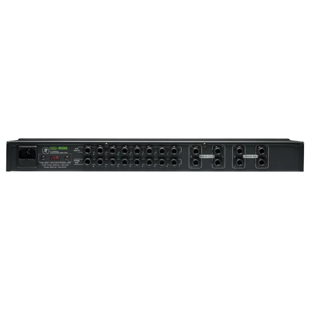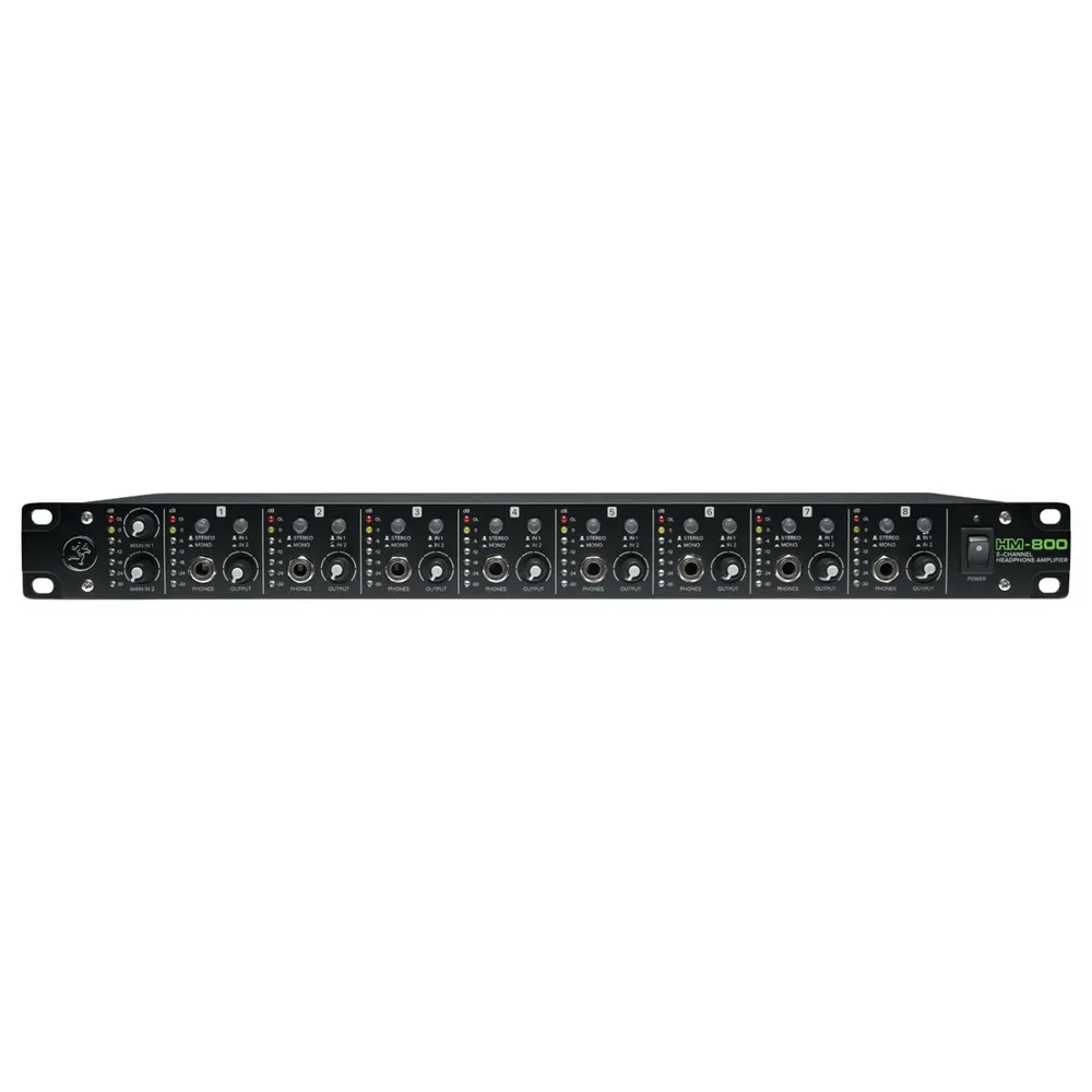 The 19” rackmount HM-800 8-Channel Headphone Amplifier offers up to 10 available mixes with a total of 16 headphone outputs. Perfect for professional applications including studios, Houses of Worship, practice spaces, and more. Featuring 2 discrete main inputs with level control plus stereo outs, aux inputs per channel.