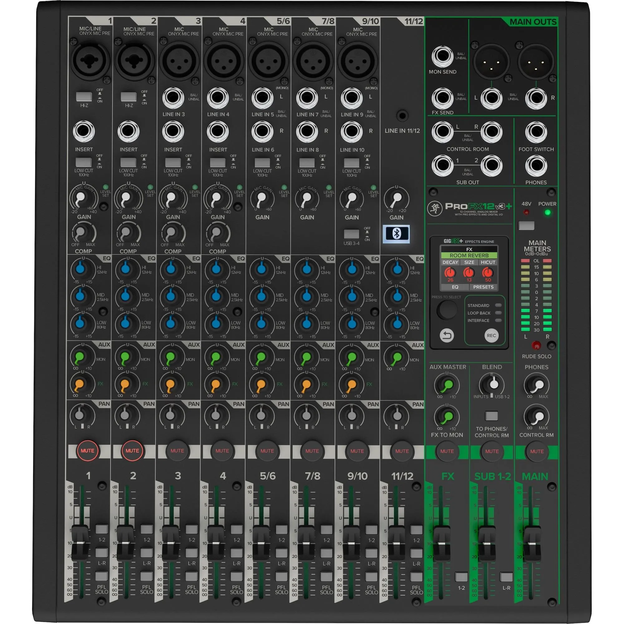 Mackie ProFXv3+ Series is a professional analog mixer and USB-C audio interface with powerful enhancements for studio-quality recordings and live streams. Capture your performance with Onyx preamps and channel EQ, add computer audio via loopback, bring in calls via Bluetooth® and enhance your sound with upgraded GigFX+ effects on a color LCD screen.
