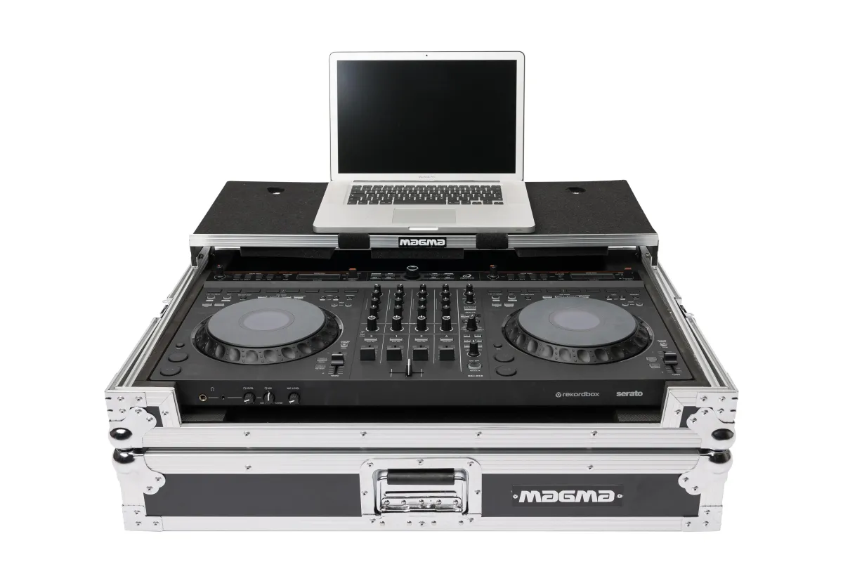Customized to transport and protect the AlphaTheta DDJ-GRV6 DJ-Controller. Crafted from 9 mm vinyl laminated plywood, sturdy aluminum profiles and heavy duty butterfly latches, it provides you with secure transport and workstation in one. Thanks to the integrated gliding laptop platform and the convenient cable access port, the setup is ready for action in no time at all.