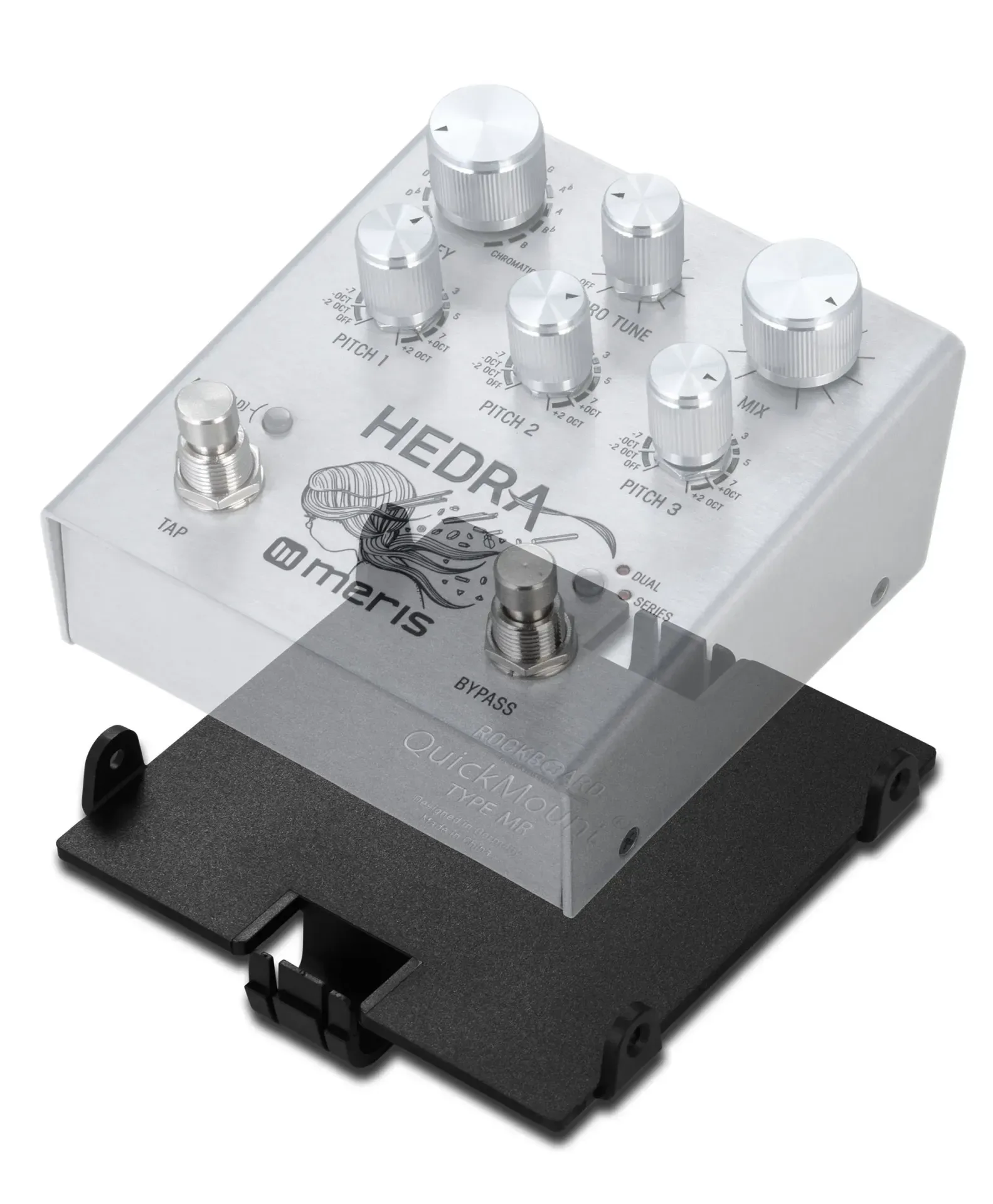 The RockBoard QuickMount Type MR is a dedicated pedal mounting plate designed specifically for Meris pedals such as the Hedra. It provides a clean, secure alternative to traditional hook-and-loop tape mounting systems.