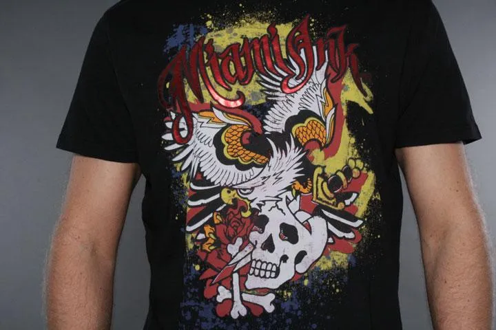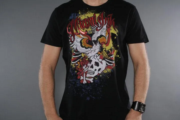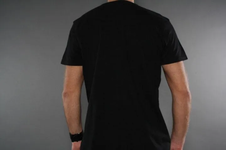 Black T-shirt with print on the chest. Details partly in red foil. 100% cotton, large.