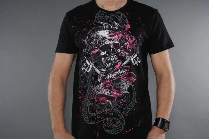 100% cotton T-shirt. Large print on the front. Black, large.