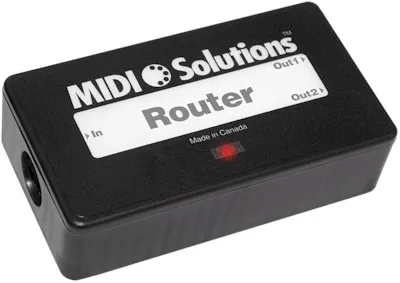 The MIDI Solutions Router is a 1-in 2-out MIDI data router/filter. Selected MIDI messages can be routed to either, both, or neither of the Router's two MIDI outputs.