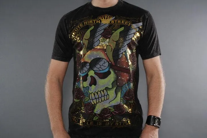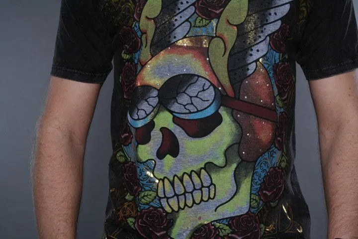 Handmade T-shirt in 100% cotton. Large print on the front and back with gold foil and stud details. Black, large.