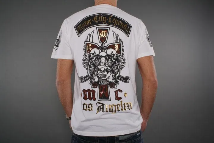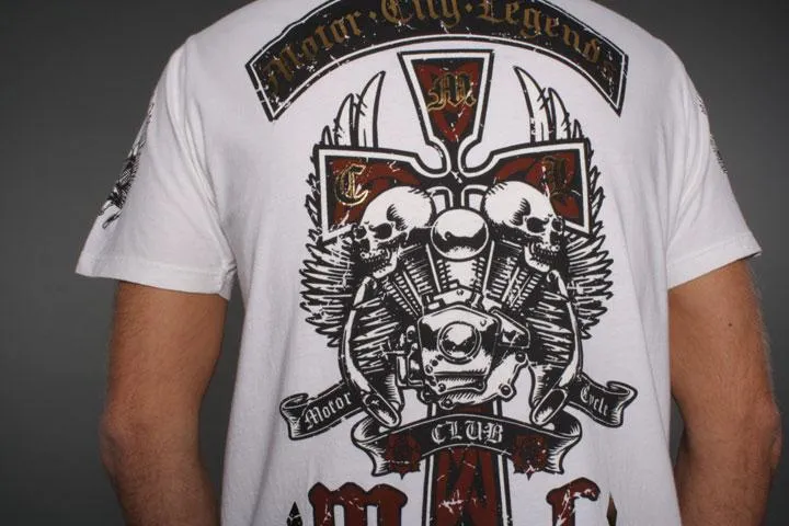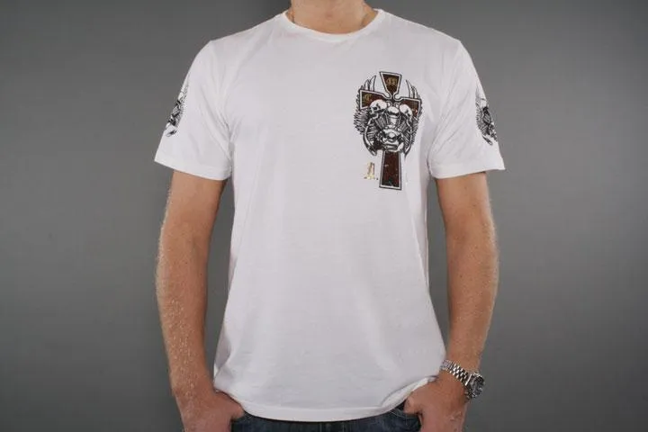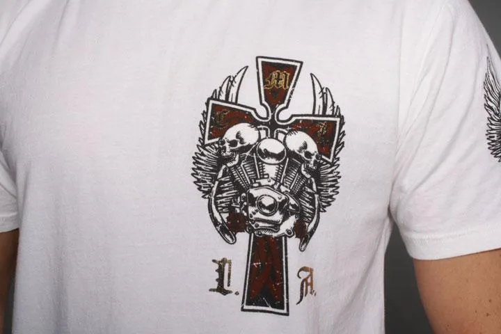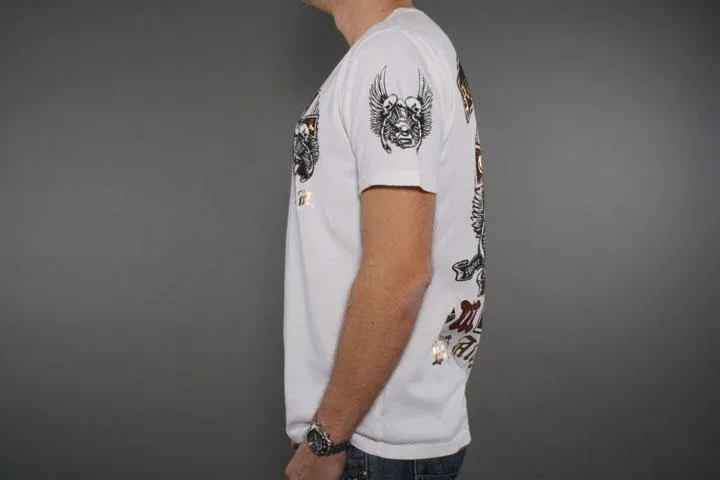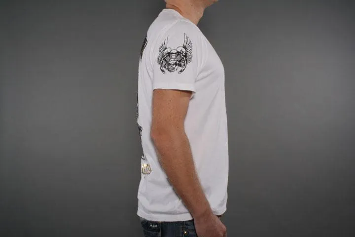 Cool white T-shirt with large print on the back in black, burgundy, and gold foil. Smaller print on the left side of the chest and small prints on each sleeve. 100% cotton. White, XXL.