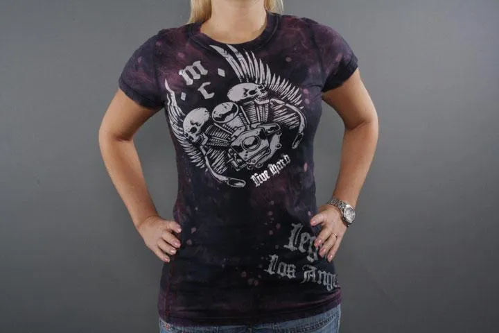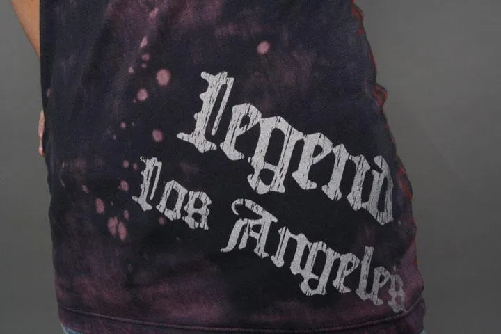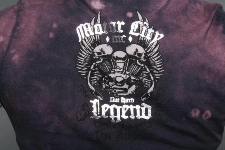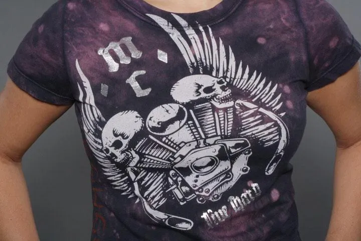 Cool black/purple T-shirt with large prints in gray and silver foil. 100% cotton. Medium.