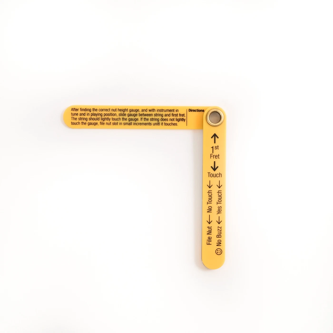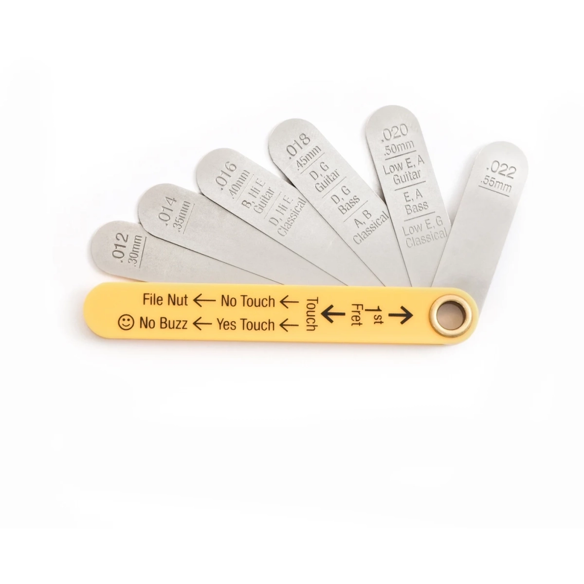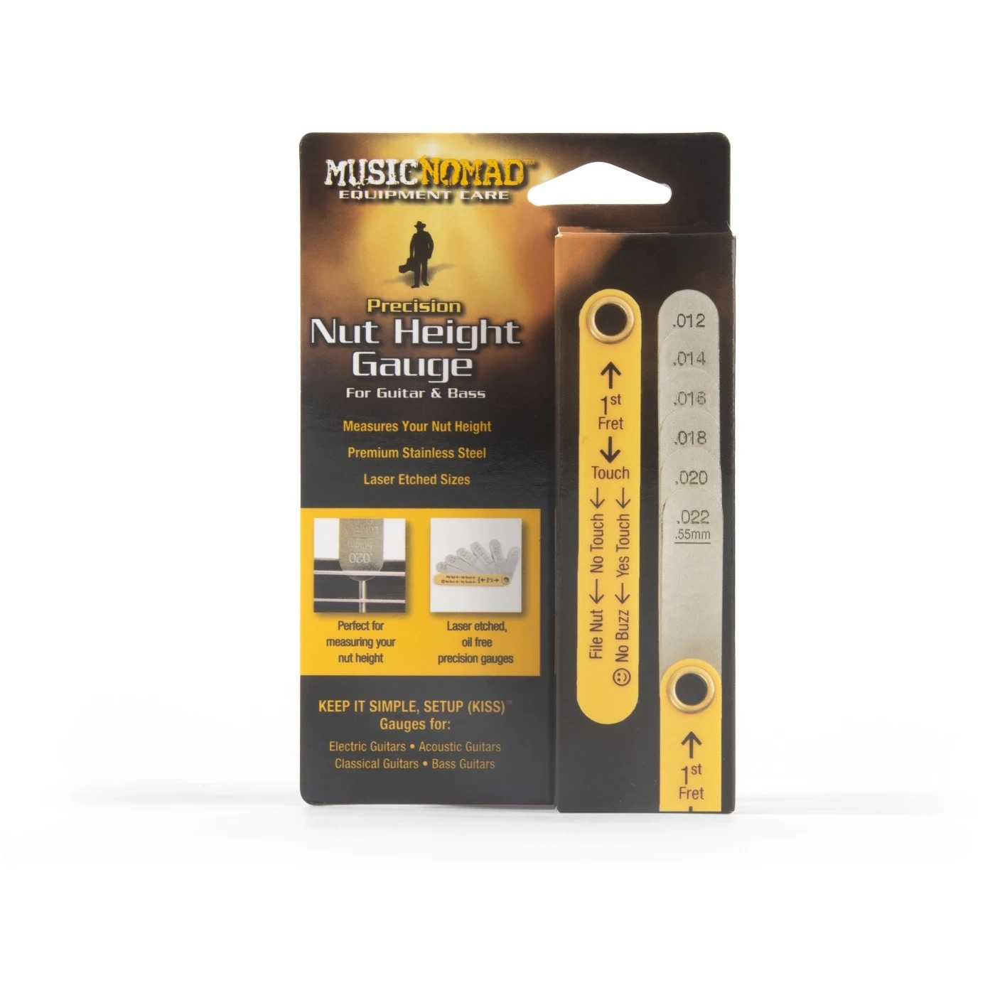 Being able to measure your string height at the nut is a critical step in the setup process. MusicNomad’s precision Nut Height Gauge will help you do it quickly & accurately. The gauge comes equipped with the 3 most common nut height sizes (.016”, .018”, .020”) plus 3 additional sizes (.012”, .014”, .022”) to accommodate a desire for lower action or a heavier pick attack. Instructions printed right on the handle makes it extremely easy to dial in your nut height. It’s perfect for electric, acoustic, classical & bass guitars & features laser etched markings that take the guesswork out of which gauge to use for each instrument. It’s made of premium stainless steel construction without the annoying, messy oil found on traditional feeler gauge sets. That's MusicNomad quality – raising the bar in equipment care.
