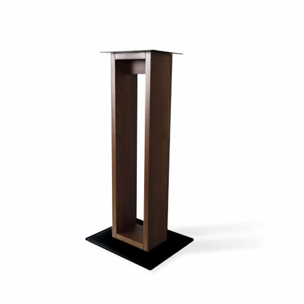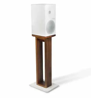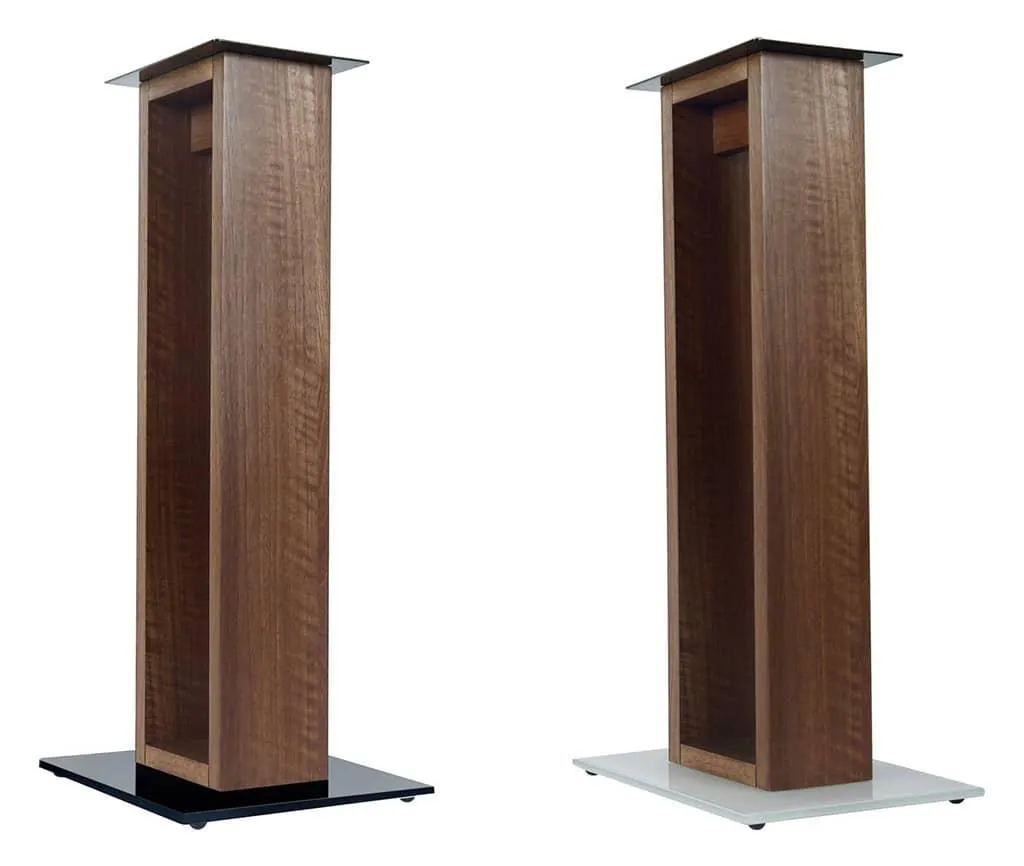 Norstone Alvä Stand is a new speaker stand made of walnut-colored wood fiber material with a colored glass base plate (black or white).