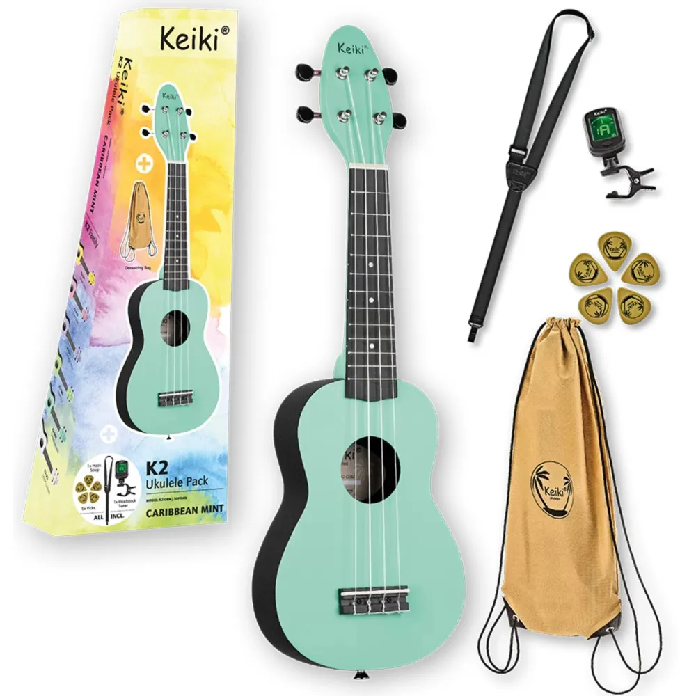 The Keiki® ukulele packs come with everything you need: a soprano-sized ukulele, a gym bag, a tuner, five picks, and a strap. The ukulele itself features an ABS body and a beautifully designed Agathis top. The K2 is now available in lemongrass, lavender field, Caribbean mint, fairy dust, tomatillo, and silent cloud design.