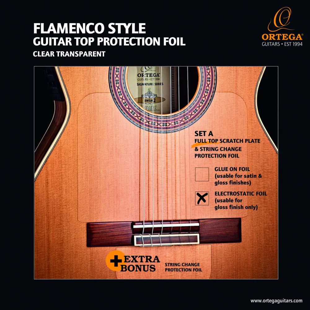 Reusable electrostatic foil set. Usable on gloss finish only. Holds with electrostatic features. Free encore: String protection foil