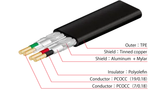 The flat designed cable prevents the signal loss caused by cable bend, change of impedance and electrostatic capacitance. And it protect signal from external/internal noise and electro-magnetic wave by combination of TPE outer sheath and double-shielding.