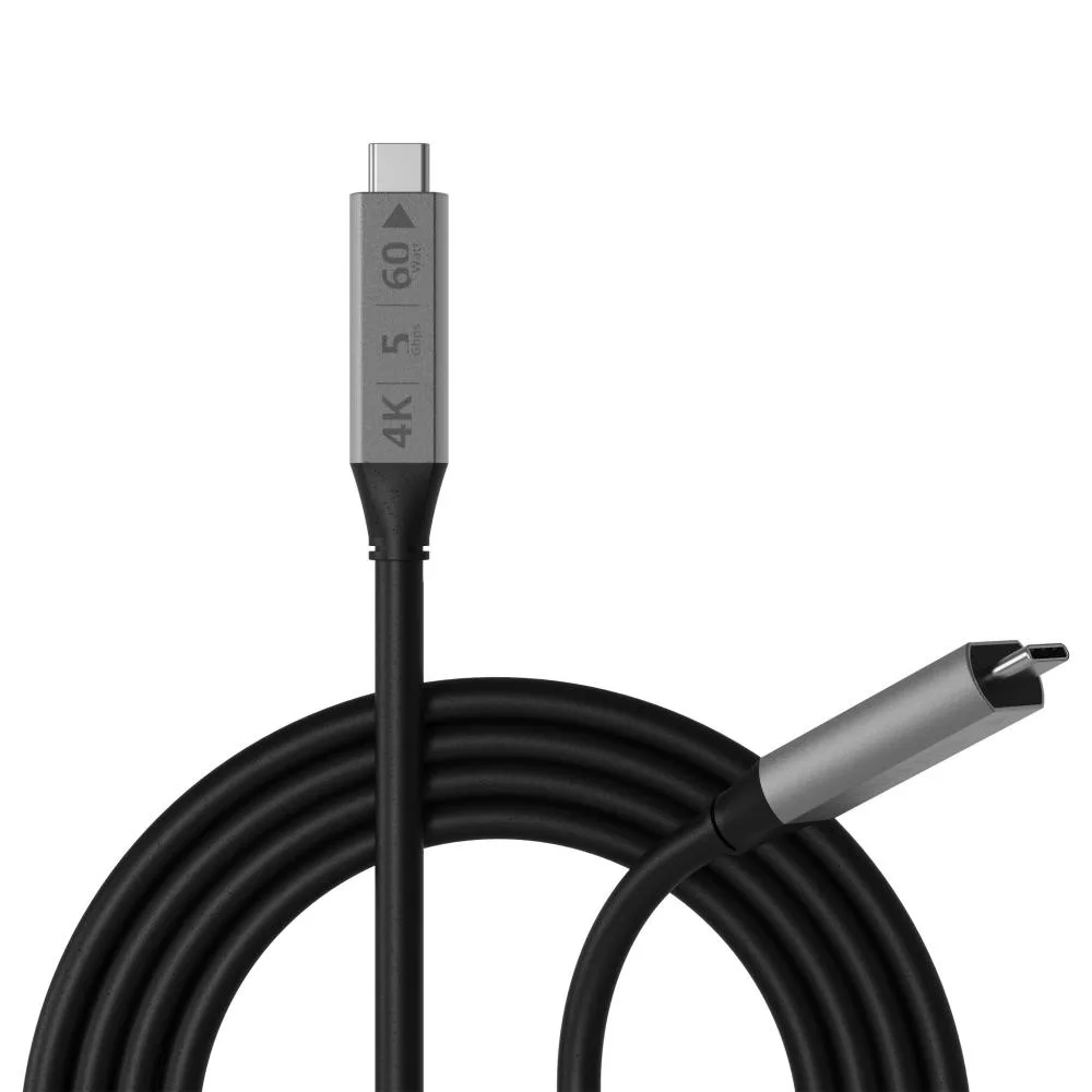 The cable supports AV signals up to 4K @ 60 Hz, USB 3.2 Gen 1 data speeds up to 5 Gbps, full backward compatibility with USB 2.0, and power delivery up to 60W (20V 3A) up to 15 m, or 30W (20V 1.5A) up to 20 m.
