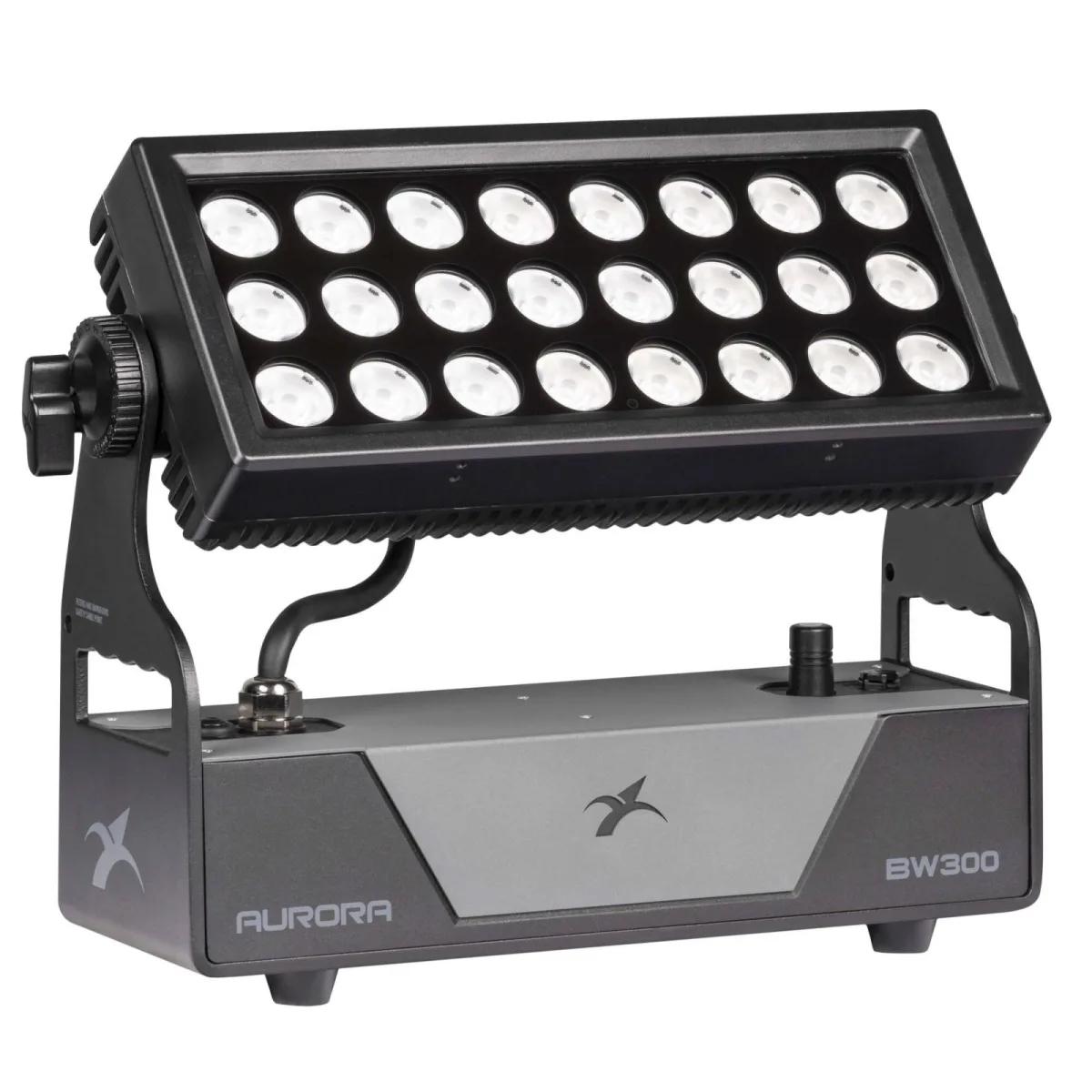 It features 24 RGBW 10W LED sources capable of producing an extraordinary luminous flux of 5500 lux at 5 meters (Full On - Overboost), characterized by brilliant and saturated shades. AURORA BW300 is completely flicker-free thanks to 5 selectable PWM frequencies up to 15,000 Hz, a silent cooling system without cooling fans, and a choice of 4 dimmer curves with adjustable response.