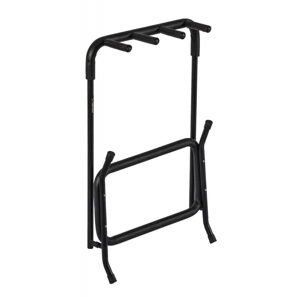 Universal 3 space steel made folding stand, to accommodate multiple guitars (classical / acoustic / electric) and bass. The contact surfaces are made of soft foam material that ensures protection of the instruments.