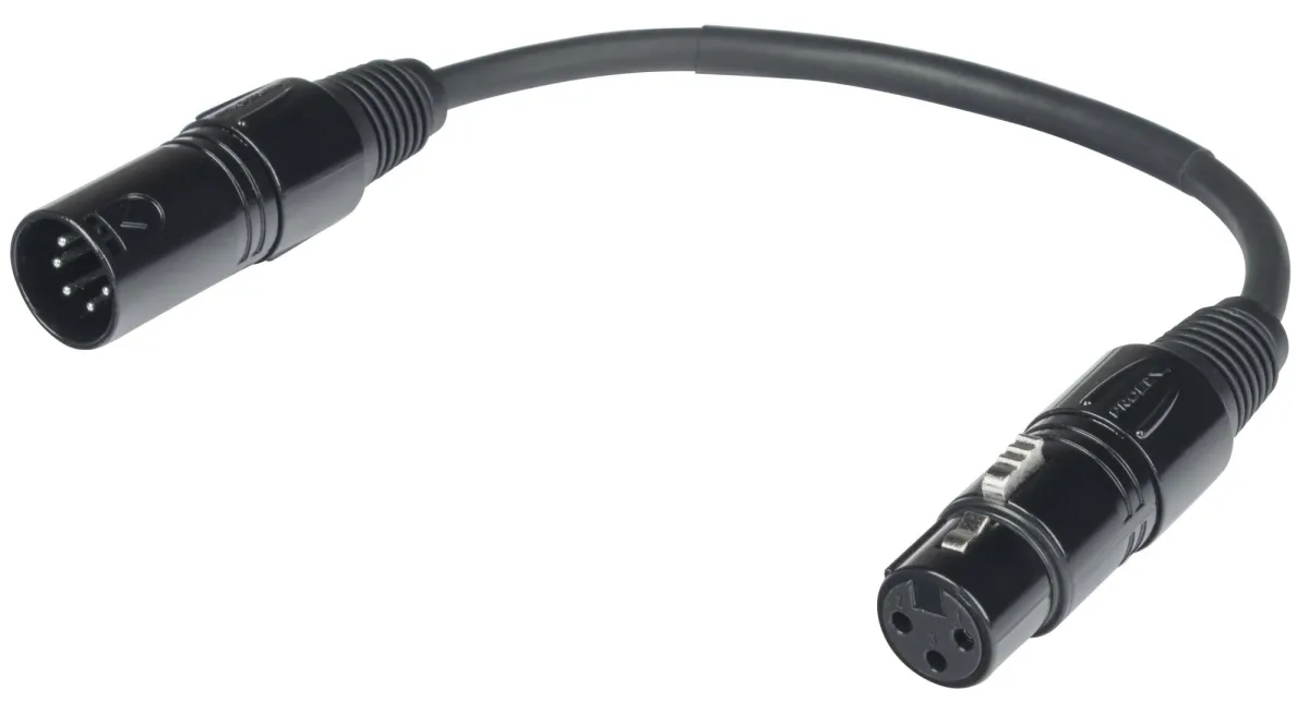 Cable, DMX512 adapter, 1 x 3-pin female XLR to 1 x 5-pin male XLR, 20 cm, black.