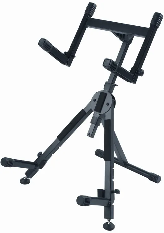 The tilt-back bottom amp holders are height adjustable to 4 positions, and can safely accommodate large size combo amps or speaker cabinets with up to 2 x 12'' speakers. The top amp platform, featuring 6 height posit ions with safety locking pin and tilt adjustability, will securely hold combo amplifiers and amp heads. When positioned horizontally and with folded support arms, the top platform can also become a very suitable accommodation for guitar effects, rack cases or small mixers, leaving enough room for up to a 27.5'' (70 cm) high combo amplifier to be placed on the bottom support arms.