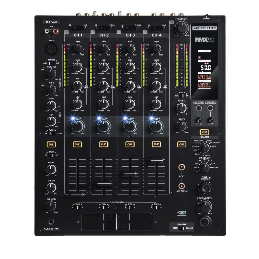 To suit different mixing and scratching styles the RMX-60 Digital’s line- and crossfader-curves are adjustable, and there’s also a linefader start function. The crossfader is freely assignable between all channels, and the stock fader can also be switched for the new RMX Innofader by Audio Innovate, which is specifically designed for Reloop mixers to offer a gentle, gliding performance.