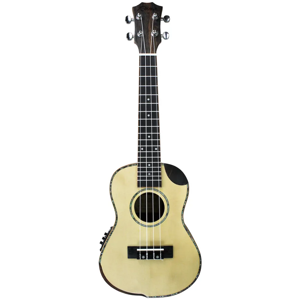 Gorgeous Grand Concert sized ukulele with armrest design and half cutaway in Ebony, including Belcat EQ electronics. This sweet-sounding ukulele has a solid Spruce top, and Caidie back and sides, and Abalone shell and wood binding.