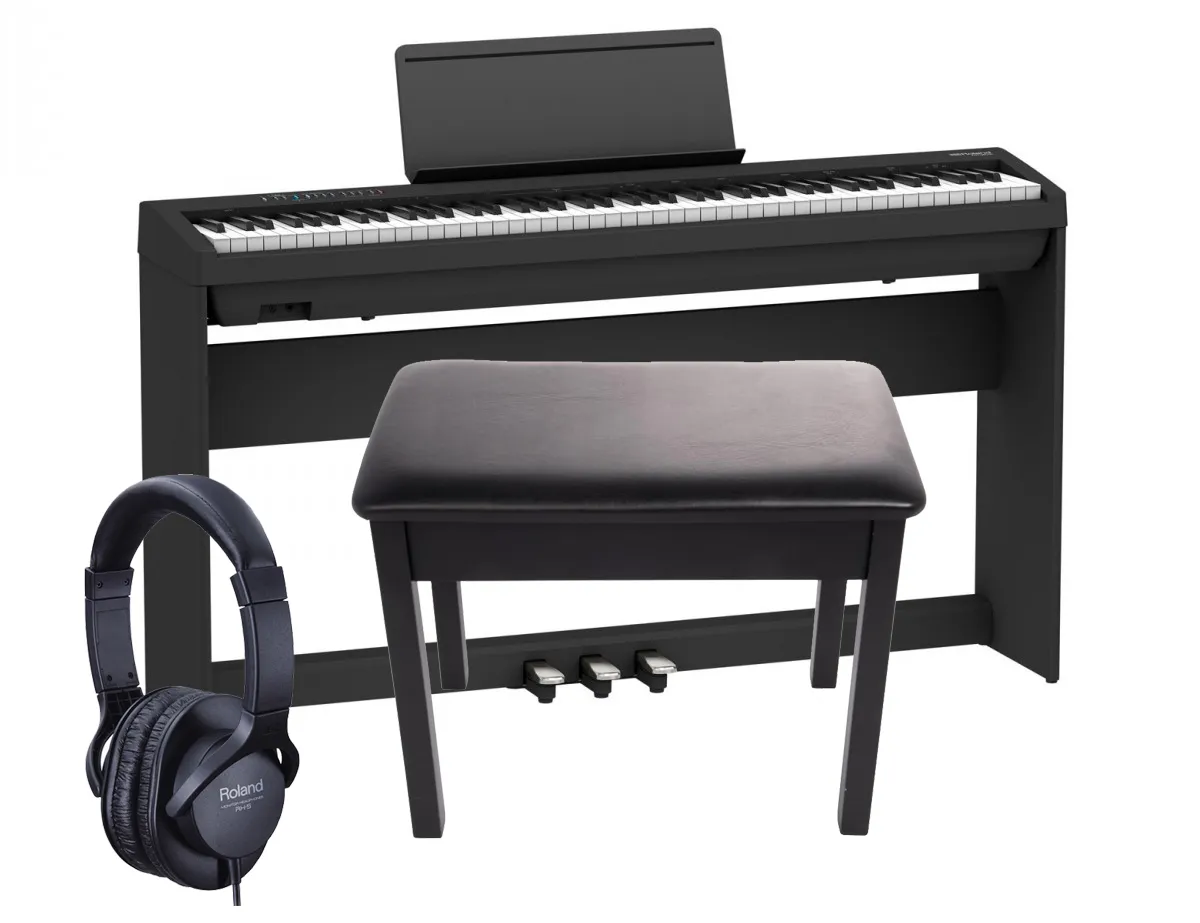 FP-30X-BK Furniture Pack: Package with FP-30X in black with stand, pedals, bench and headphones.