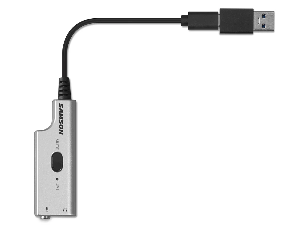 The UP1 is an analog-to-digital USB audio adapter with a 1/8” (3.5mm) microphone input and 1/8” (3.5mm) headphone output. It features a USB Type-C connector and includes a USB C to USB A adapter to connect to any computer.