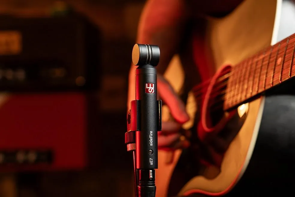 The sE7 sideFire is a variant of the sE7 high-quality back-electret small-diaphragm condenser microphone intended for a wide range of studio and live sound applications, from acoustic guitars to pianos to drums and beyond, with a rotated capsule to allow for close miking.