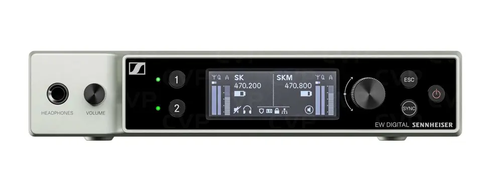 The Sennheiser Evolution Wireless Digital system offers a half-rack receiver with a wide switching bandwidth of up to 88 MHz. It is equipped with PoE IEEE 802.3af Class 3 for easy network control and has an OLED display for a clear user interface. The receiver also features secure AES 256 encryption and an external PSU for reliable performance, all housed in a sturdy metal casing.