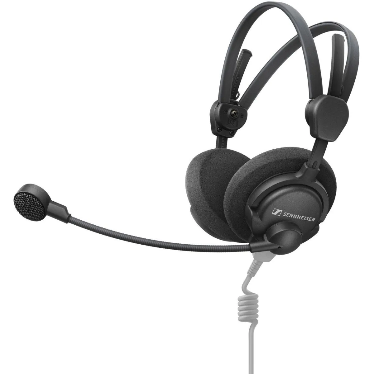 The Sennheiser HMD 46 (Article No. 700313) is a professional broadcast headset designed for intercom and communication tasks in radio, TV, stage production and similar environments. It features an open on-ear design delivering natural sound reproduction from 16 Hz to 20 000 Hz with low distortion and clear audio, plus a dynamic noise-compensated microphone with a hyper-cardioid pattern for intelligible speech even in noisy conditions. The headset is lightweight, comfortable for extended use and offers flexible functions such as a swiveling ear cup for single-sided listening and a microphone boom that can be positioned on either the left or right side. The HMD 46 is supplied without cable to allow customization for specific system needs.