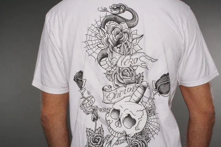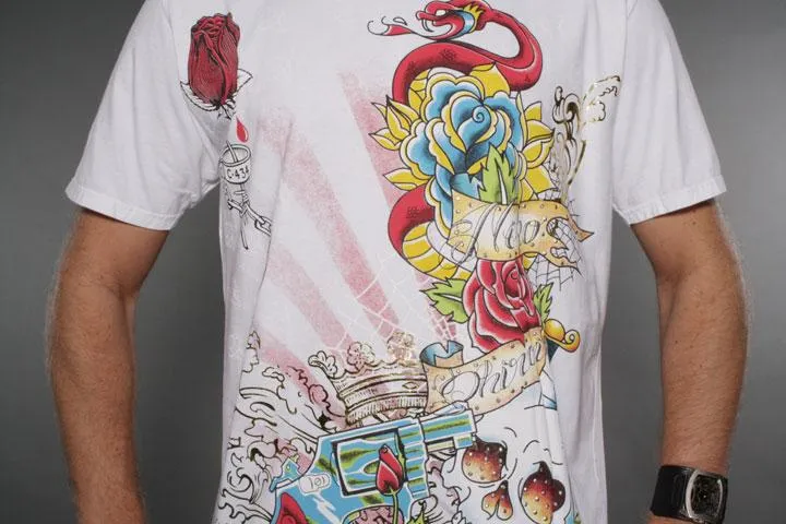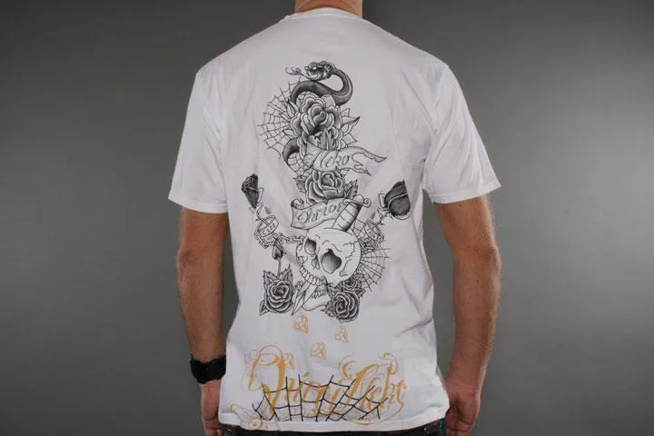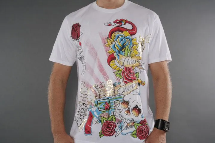 Handmade T-shirt with large multicolored and gold foil print on the front (with studs) and print on the back. 100% cotton. White, XL.