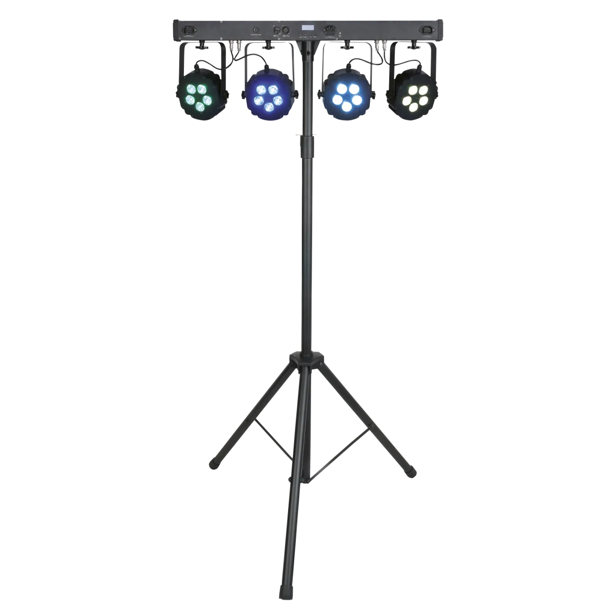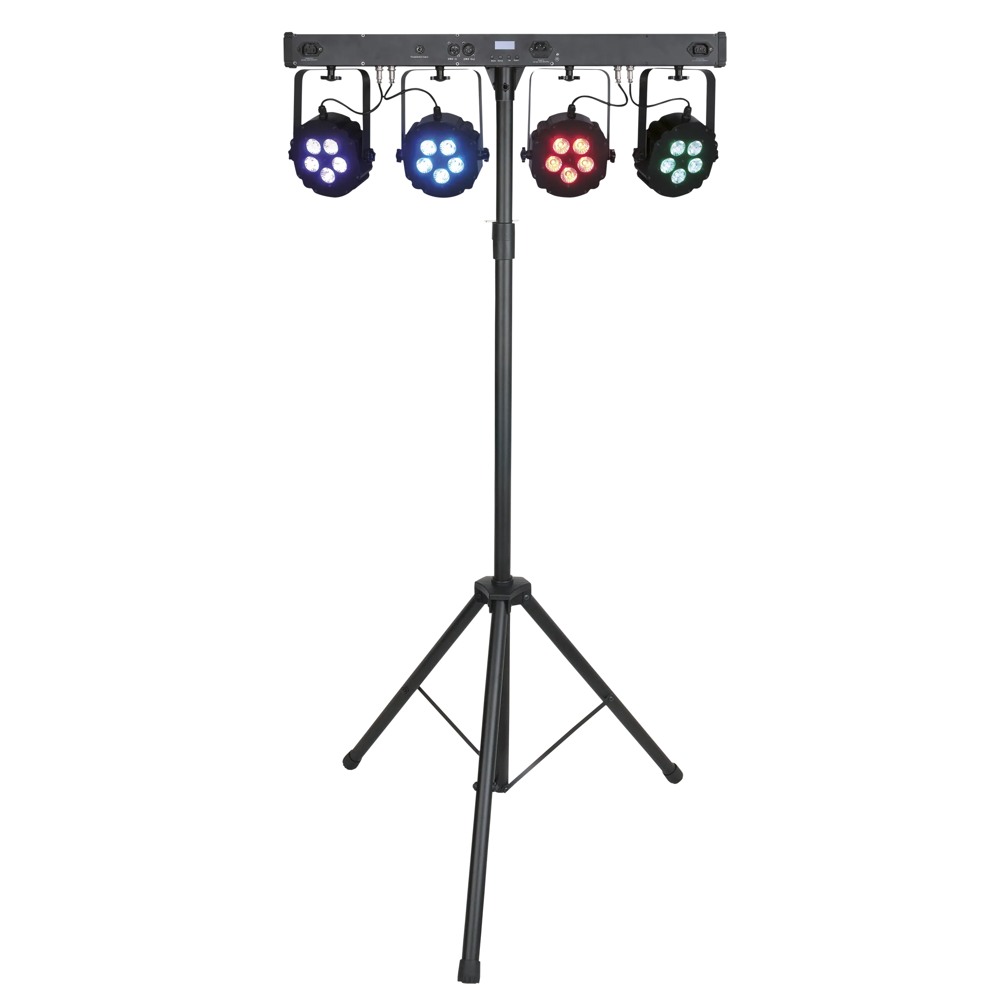 The Showtec compact power lightset 4 RGBW is a T-bar with 4 LED spots on a light stand, packed in a hard case and a carrying bag for the stand. It is a plug and play set that offers internal chase programs but also can be controlled by DMX or with the optional available footswitch. In DMX mode it offers different DMX personalities in order to give a basic mode for easy control and advanced modes for total control. The compact power lightset 4 RGBW is the ideal solution with a fast setup time and high power output. The white colour also makes it possible to create beautiful pastel colours.