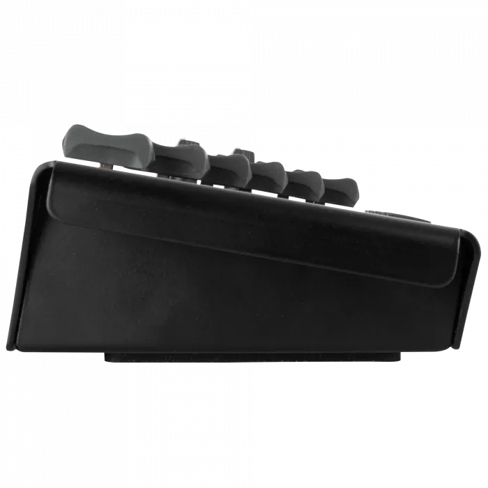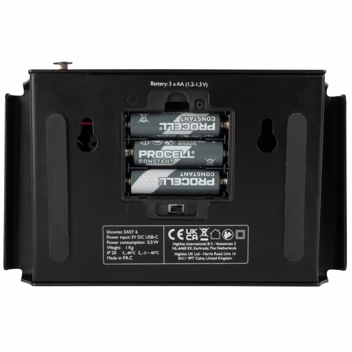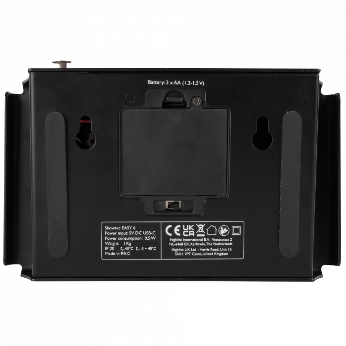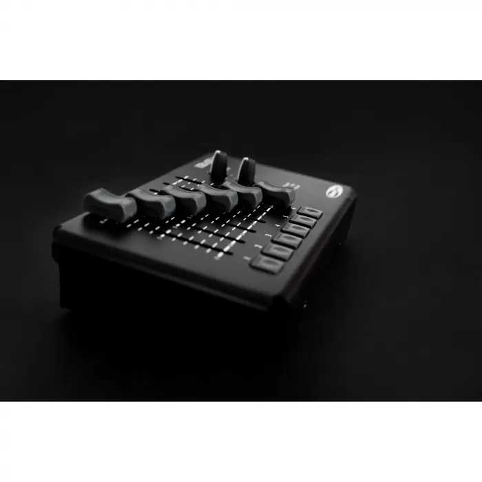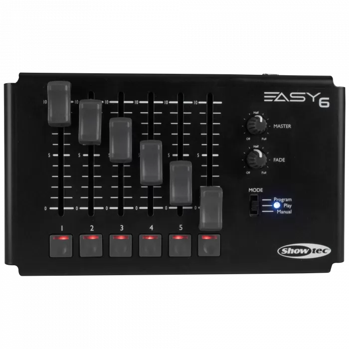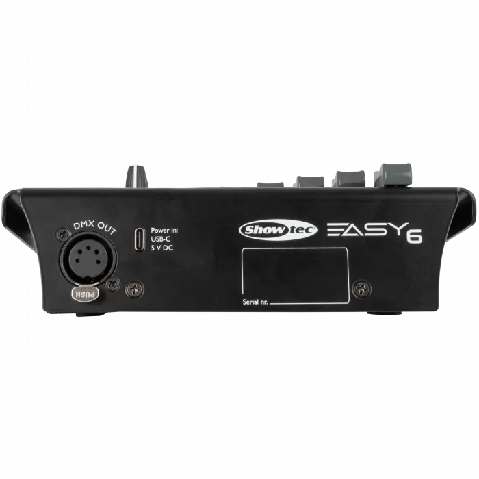 The Showtec Easy 6 is a compact, 6-channel DMX controller with 6 faders, 6 buttons with integrated LEDs, a mode button, a rotary fade knob and a master dimmer knob. It's ideal for situations with simple light setups like exhibitions or small shops, or for stage crews to test DMX equipment. With integrated handles and 2 mounting slots, the Easy 6 can be used in different ways. Scenes can be stored on each of the buttons and the integrated LEDs indicate whether a playback scene is stored on a button or not. In manual mode, the faders set the dimmer values, in playback mode, stored scenes are output when the buttons are pressed and in program mode, pressing a button stores the fader value. The side of the controller has a DIP switch that makes it possible to change the starting address of the 6 channels. The controller can be powered by USB-C or 3 AA batteries.