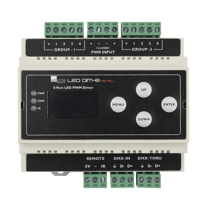 The Showtec LED Dim-8 Install is the ideal compact fixed-installation PWM dimmer for you. All connections are easy connectable with the plug-in Phoenix terminals. The LED Dim-8 Install is very user friendly and universal configurable for various LED strips. It can control 12 V to 24 V constant voltage strips by DMX or used as stand-alone controller for single scene and chases. The user interface is very friendly due to high quality O-LED display and different menu languages. It can handle maximum 8 A single channel current and 25 A maximum total current. The din-rail mounted LED Dim-8 control your RGBW strips and is ideal for network system integration projects.