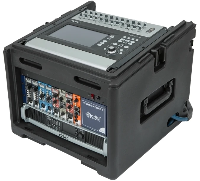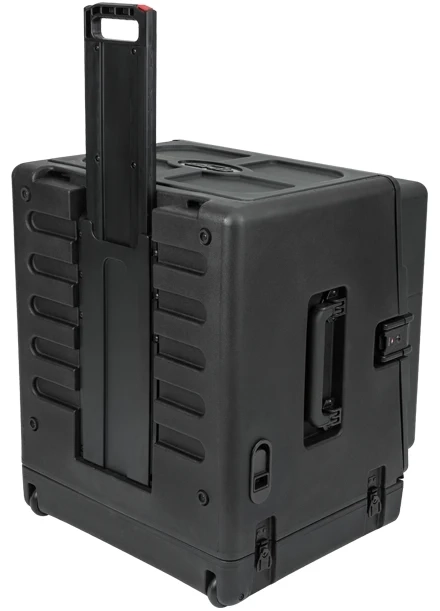 SKB-R106W Rolling Compact Rig features a standard 10U top and 6U front and rear rack rails. It also includes a new one-touch pull handle and back lid mounted wheels for easy transport, as well as a redesigned exterior that allows this new Rig to easily stack with existing standard Roto-Racks and the recently updated Roto Rolling Racks. Featuring an injection-molded top, the new Rolling Compact Rig also comes standard with TSA-accessible locking latches that secure the lid to the top of the rig.