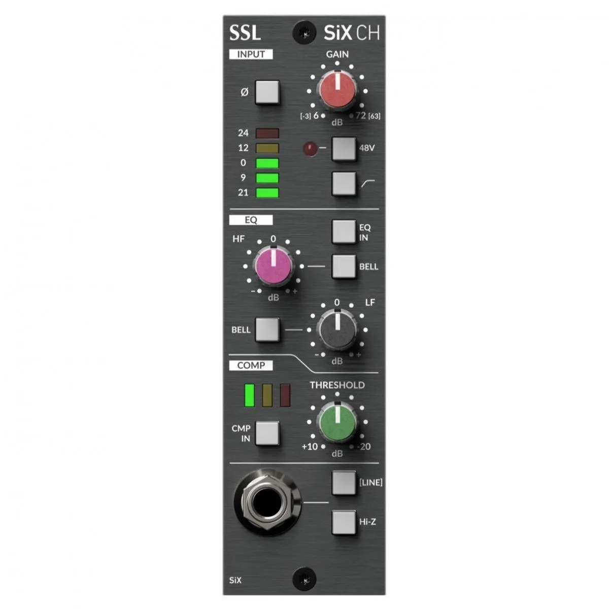 The SSL SiX Channel is a single-width 500 Series mini channel strip using the SuperAnalogue channel processing features from SSL’s SiX console including the Mic-pre, low and high frequency EQ, as well as the single knob compressor. The SiX Channel is a simple way to add additional Mic/Line inputs to the line level inputs of any professional audio device, including the Stereo channels of the SiX console. It is also a flexible way to create a professional modular mixer from a ‘summing’ 500 Series rack unit.