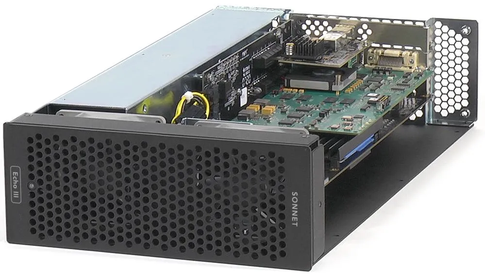 The DuoModo™ Echo™ III Module connects up to three PCIe cards to computers without card slots. The module supports three full-height, full-length Thunderbolt™-compatible non-GPU PCIe cards; provides 400W of power for the most demanding of PCIe cards, including qualification from Avid for Pro Tools | HDX PCIe cards; features quiet, dual temperature-controlled Noctua fans rated at 17 dbA; and connects through super fast 40Gbps Thunderbolt interface.
