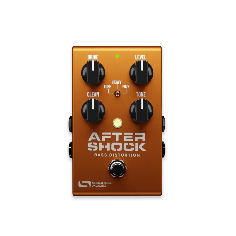 Source Audio One Series AfterShock Bass Distortion levererar ett brett spektrum av kraftfulla basdistortionljud, från subtil värme till aggressiv fuzz, i ett kompakt och mångsidigt format.