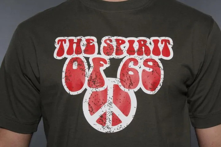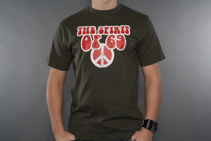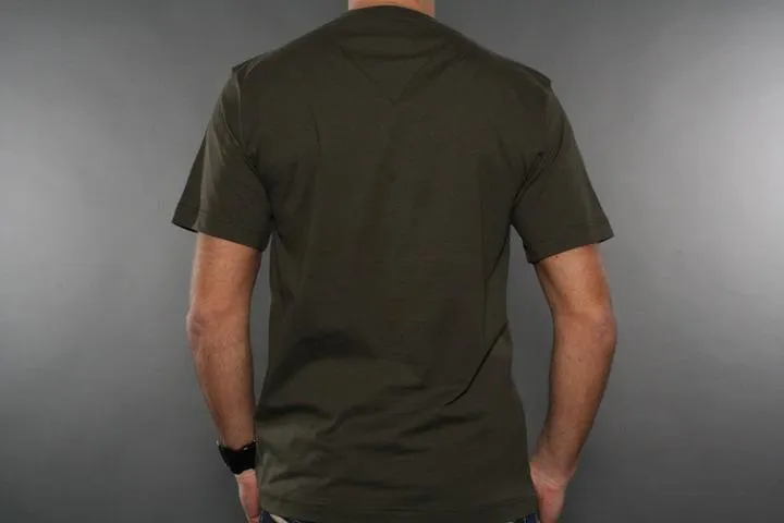 Olive green t-shirt with red and white print on the chest. 100% cotton. Men's, olive, small.