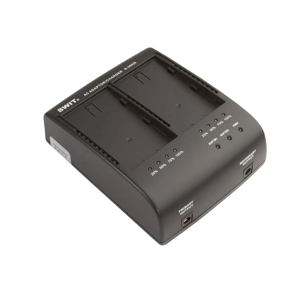The SWIT S-3602I Dual Charger/Adapter has two charging channels with 7-8.4 VDC, 2A output each for simultaneously charging two batteries. It is compatible with the SWIT S-8i50 and JVC SSL-JVC50 batteries. Four-level LED charging indicators for each channel indicate the percentage of charge remaining.