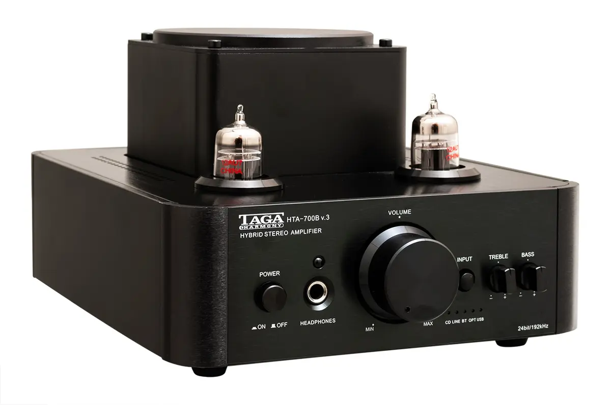 The sleek aluminum design makes this hybrid amplifier suitable for most interiors. The construction utilizes two U.S.A.-made 5BK7 vacuum tubes in the preamp section combined with transistor output stages to deliver a very warm, linear, and lifelike sound with high dynamic performance.