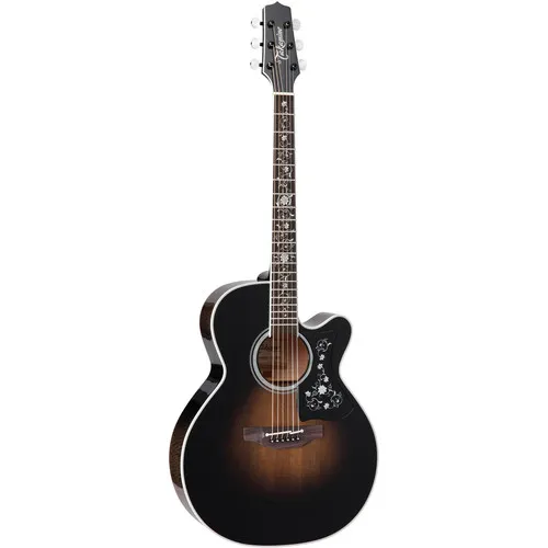 The transparent blackburst EF450C TT TBB from Takamine is a Thermal Top Series NEX model acoustic/electric guitar with a cutaway body. Producing a bold and articulate voice, the instrument is constructed with a solid thermal spruce top, a solid flame-maple back and flame-maple sides, a maple neck, and ebony fingerboard. The neck has a nut width of 42.5mm for a smooth and comfortable feel with fast playability. Before construction, the top wood is treated with high heat to modify the resins and sugars in the wood, which imparts a played-in vintage tone and feel that is surprising for a brand new instrument. The quick response, balance, and projection is yours right out of the case.
