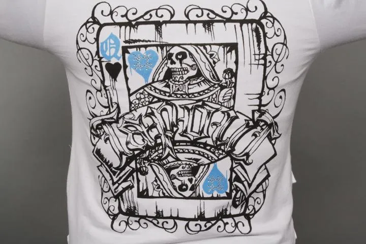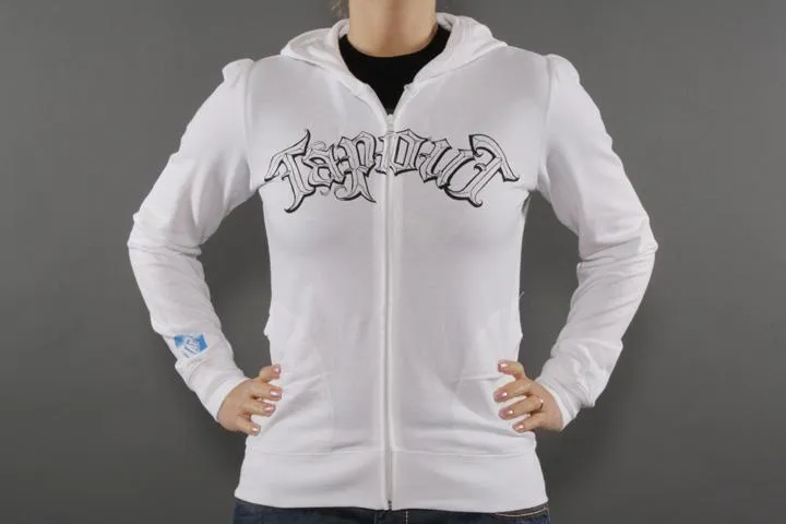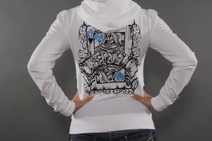 Zip-up hoodie for girls with print on the chest, one sleeve, and back. The print on the back is partially decorated with crystals. 100% cotton. White, small.