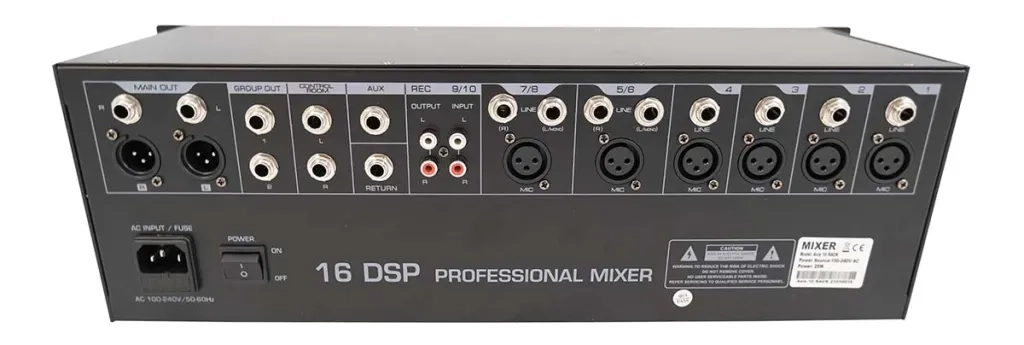 The compact Axis 10 Rack has 10 channels, of which the first 6 channels both have built-in microphone preamplifiers with balanced XLR connectors and line inputs. Channel 5/6 and channel 7/8 can be used as dedicated stereo inputs for keyboard instruments and other equipment with a stereo signal. While channel 9/10 is a stereo channel with phono/RCA and TRS minijack connectors for various media players or other DJ equipment. If you connect an MP3 player, via cable or USB, the sound is controlled from channel 9/10.