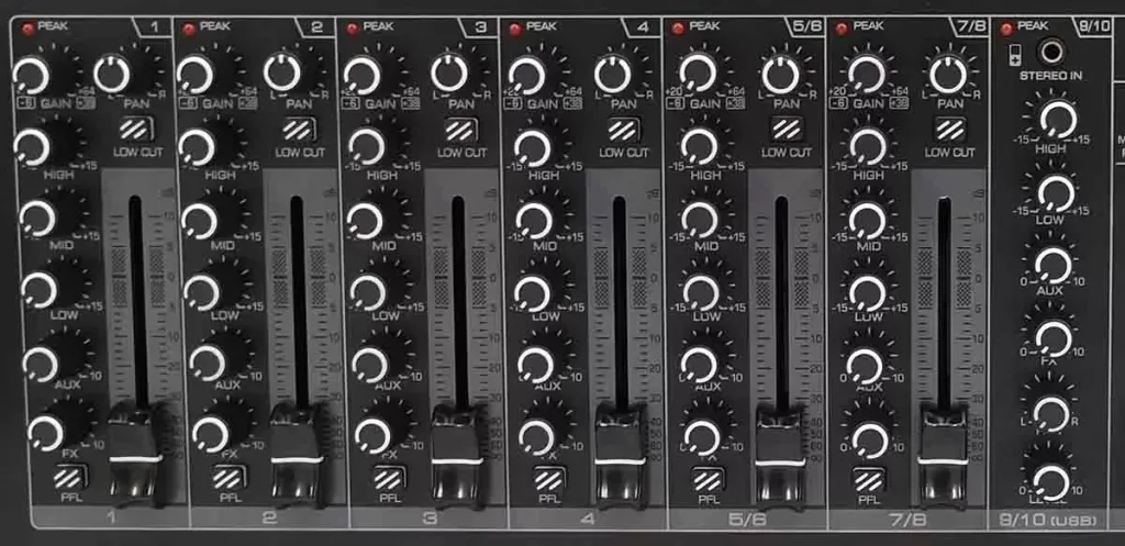 Each channel has its own gain control with overload section, and you get a comprehensive tone control section with both treble, midrange and bass control. The first 8 channels have sliding faders and PFL as well as low cut to remove rumble in the audio signal, which can give a cloudy sound image.