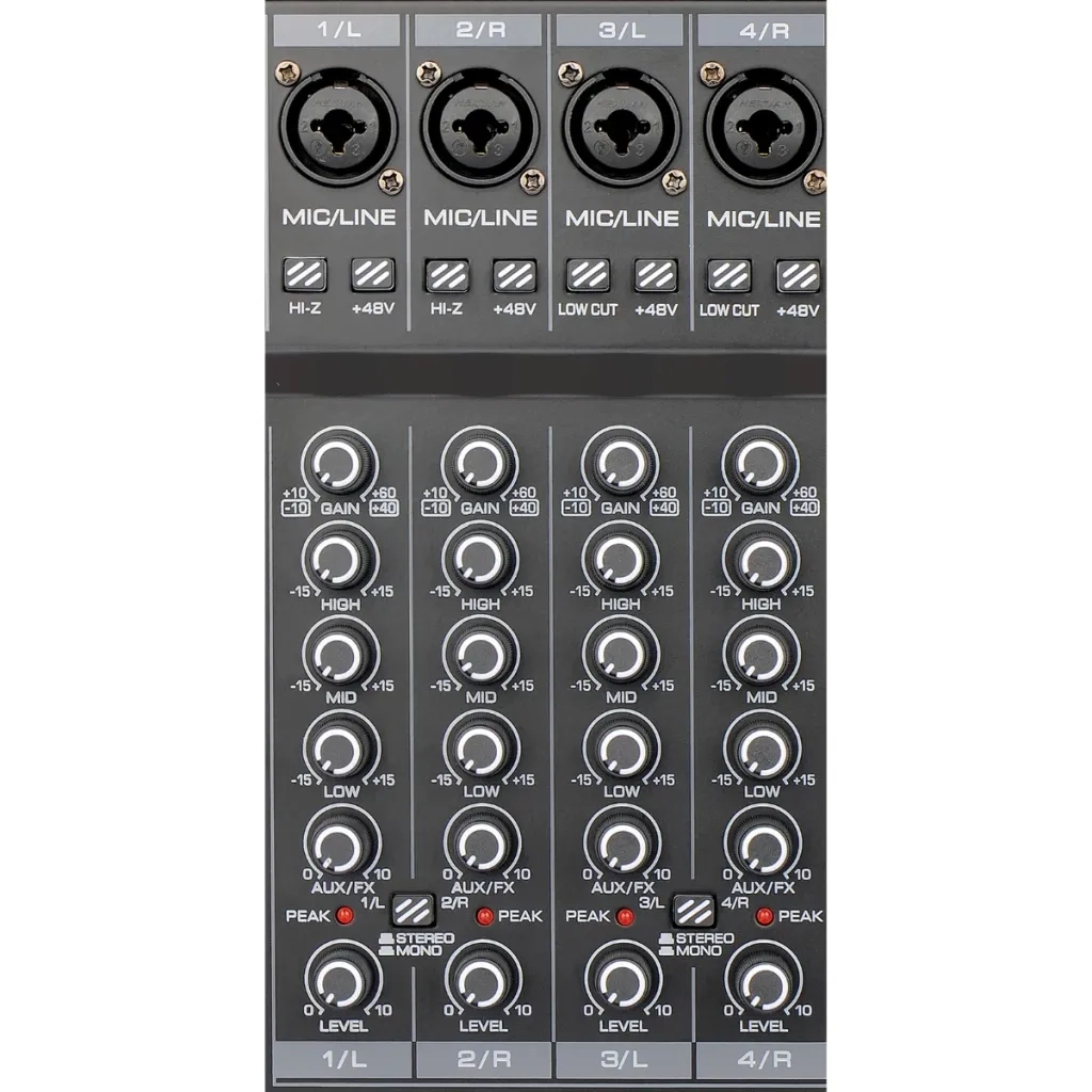 The first 4 channels both have integrated microphone preamps with balanced XLR connections and line inputs. Channel 3/4 and Channel 5/6 can be used as unique stereo inputs for keyboard instruments and other devices with a stereo signal. Channel 7/8 is a stereo channel with Phono and TRS mini jack connections for various media players or other DJ equipment. If you connect an MP3 player via cable or USB, the sound is controlled via channel 7/8.
