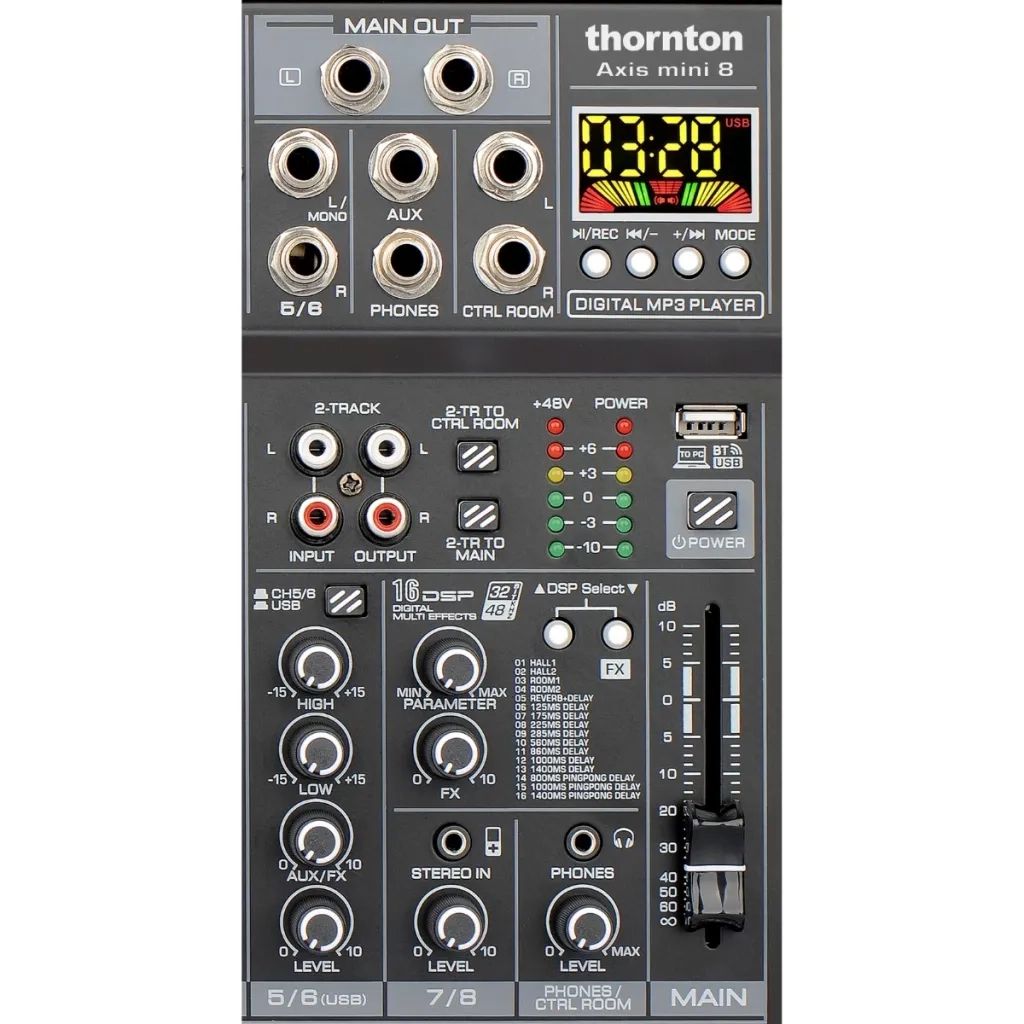 Each channel has its own gain control, and you get an equalizer with treble, middle and bass controls. Channels 1 through 6 have faders and PFL as well as a low cut to remove the rumble in the audio signal, which can result in a blurred sound image. The mixer has a built-in MP3 player so you can plug a USB port directly into the mixer and control the music directly from Axis 8. You can even connect to the MP3 player via Bluetooth and play music wirelessly from a smartphone or tablet, or you can connect a computer and play your music from there.