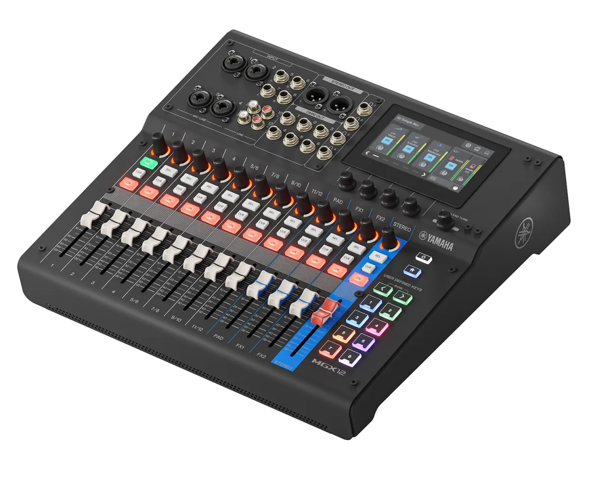 The Yamaha MGX12 BK (black) is a compact and powerful digital mixer for live, streaming, and recording use. It has 12 channels with 8 mix buses, 2 effects sends, and 1 CUE, as well as 1 stereo channel. Equipped with a 4.3-inch touchscreen and 11 + 1 faders (non-motorized) for easy control. Each channel has a rotary control, as well as Select, Cue, and On buttons. The mixer box has a built-in DSP for latency-free monitoring and supports Bluetooth 5.0 (A2DP).