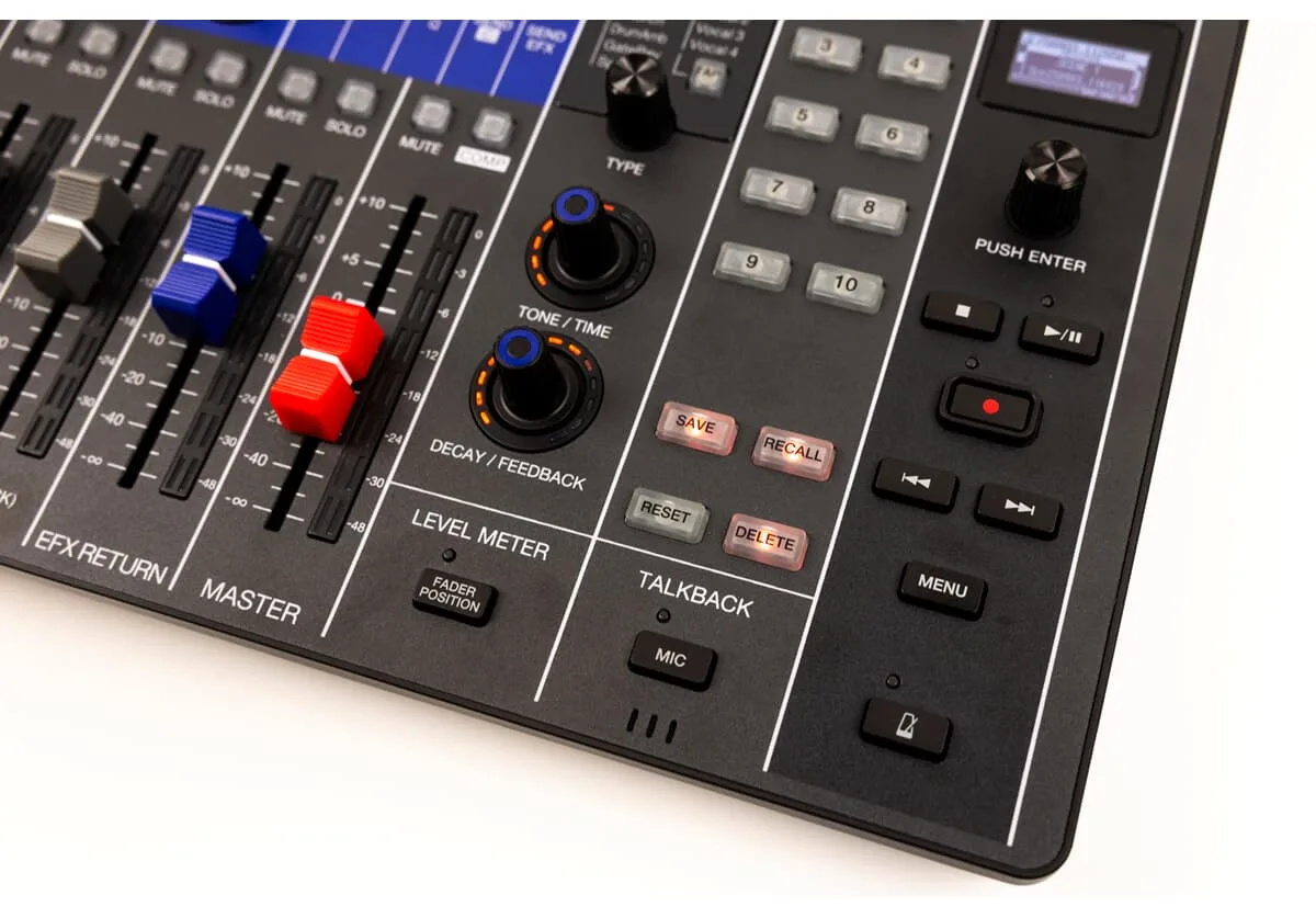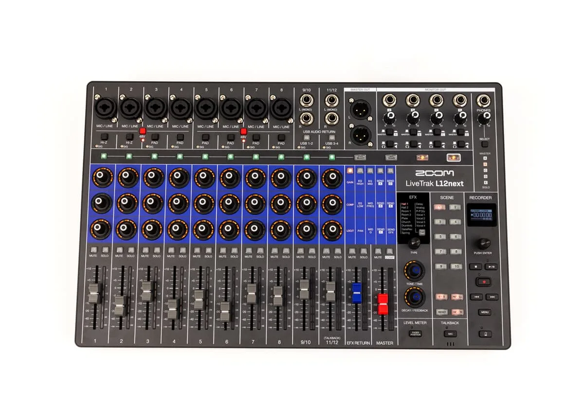The LiveTrak L12next combines the power of a digital mixer with an intuitive, analog workflow. With three knobs per channel, you get direct access to EQ (High/Mid/Low), and a simple switch lets you control gain, panning, and sends—without having to navigate through menus.